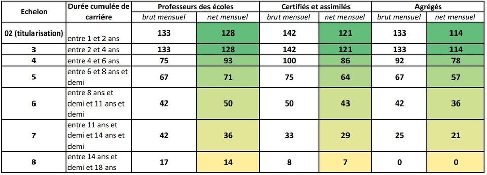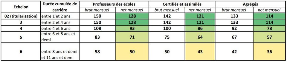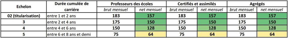 La revalorisation serait de 1880 € nets annuels (soit 157 € nets mensuels) pour l’échelon 2 et 769 € nets annuels (soit 64 € nets mensuels) pour l’échelon 5.