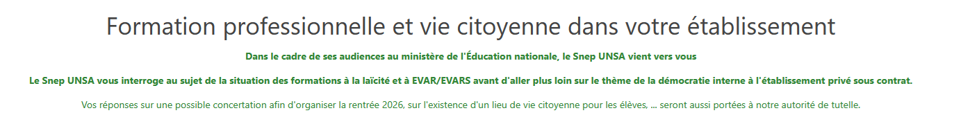 Le Snep UNSA vous interroge au sujet de la situation des formations à la laïcité et à EVAR/EVARS avant d'aller plus loin sur le thème de la démocratie interne à l'établissement privé sous contrat.